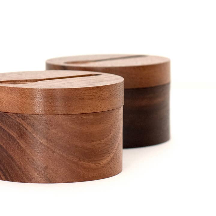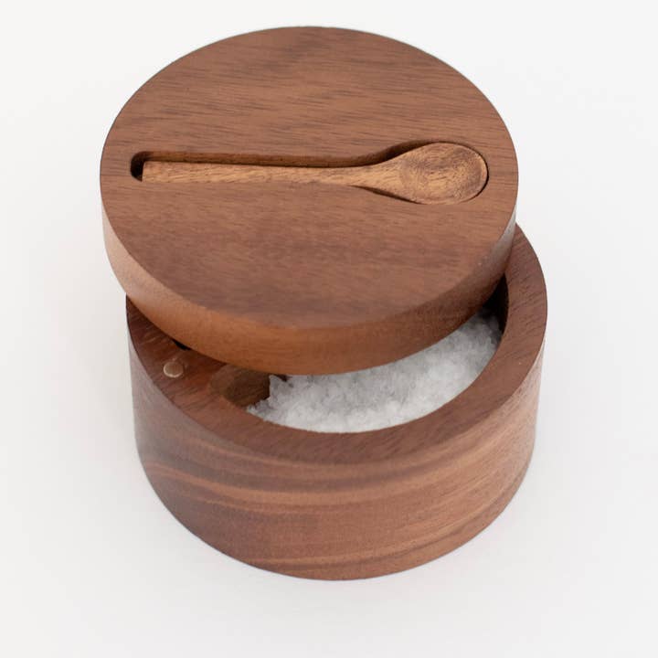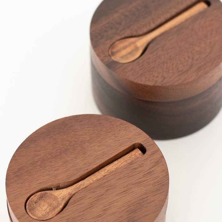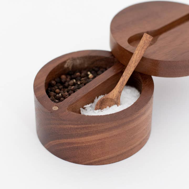 Handcrafted from warm acacia wood, this double seasoning pot keeps everyday flavours close at hand. Two separate compartments organise your favourite salts and spices, while the smooth swivel lid turns to open and protects contents from dust and moisture. A simple, tactile piece for calm, functional kitchens.
