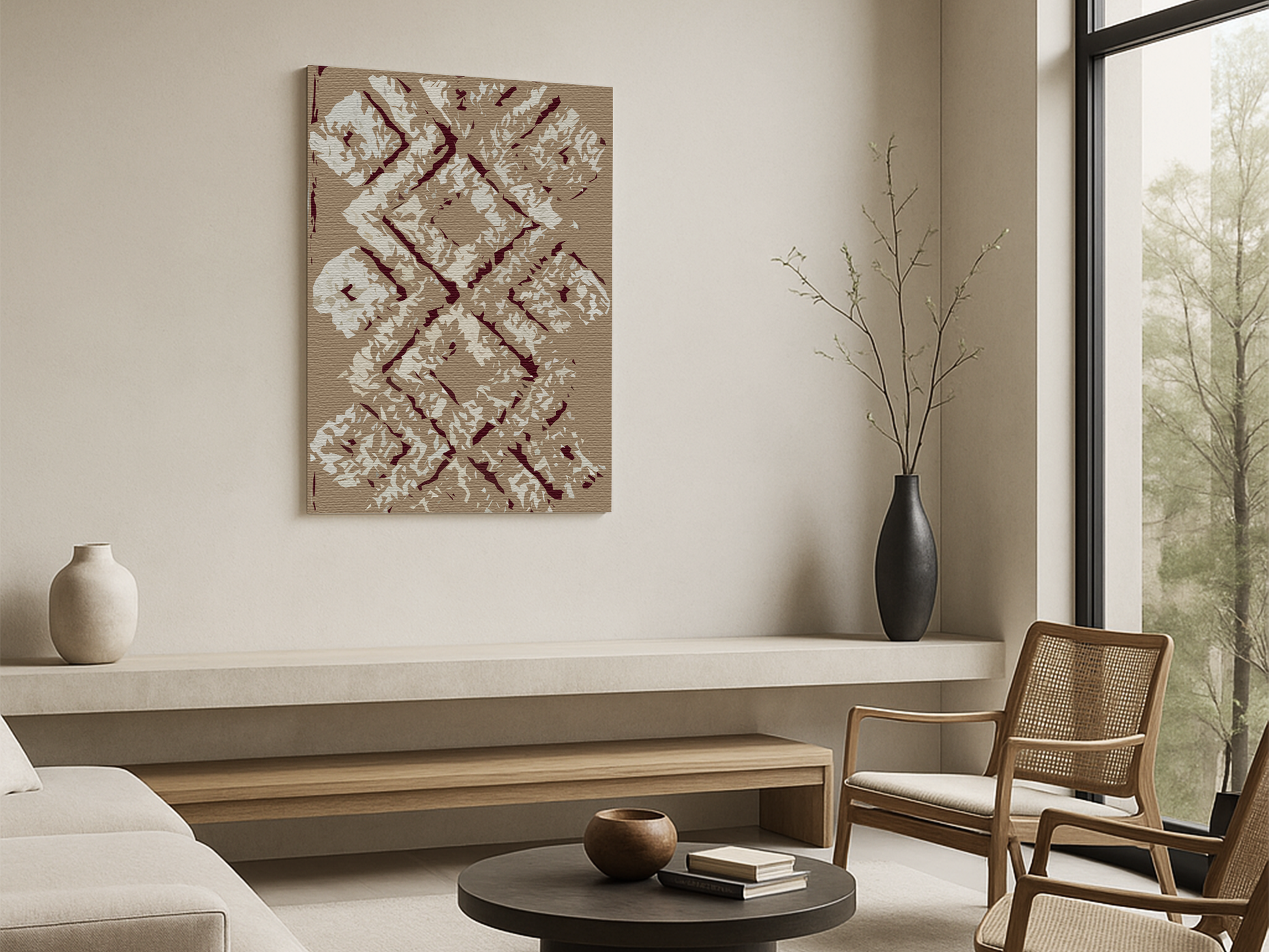 Faded sandstone meets deep ox-blood accents in a weather-worn diamond lattice. Desert Diamond Echo reimagines the storied motifs of our Desert Diamond hand-woven rug, layering soft taupe and hints of burgundy to mimic sun-bleached fibres and time-polished edges. The result is a piece that feels unearthed from an ancient caravan route yet perfectly at home in a modern interior.