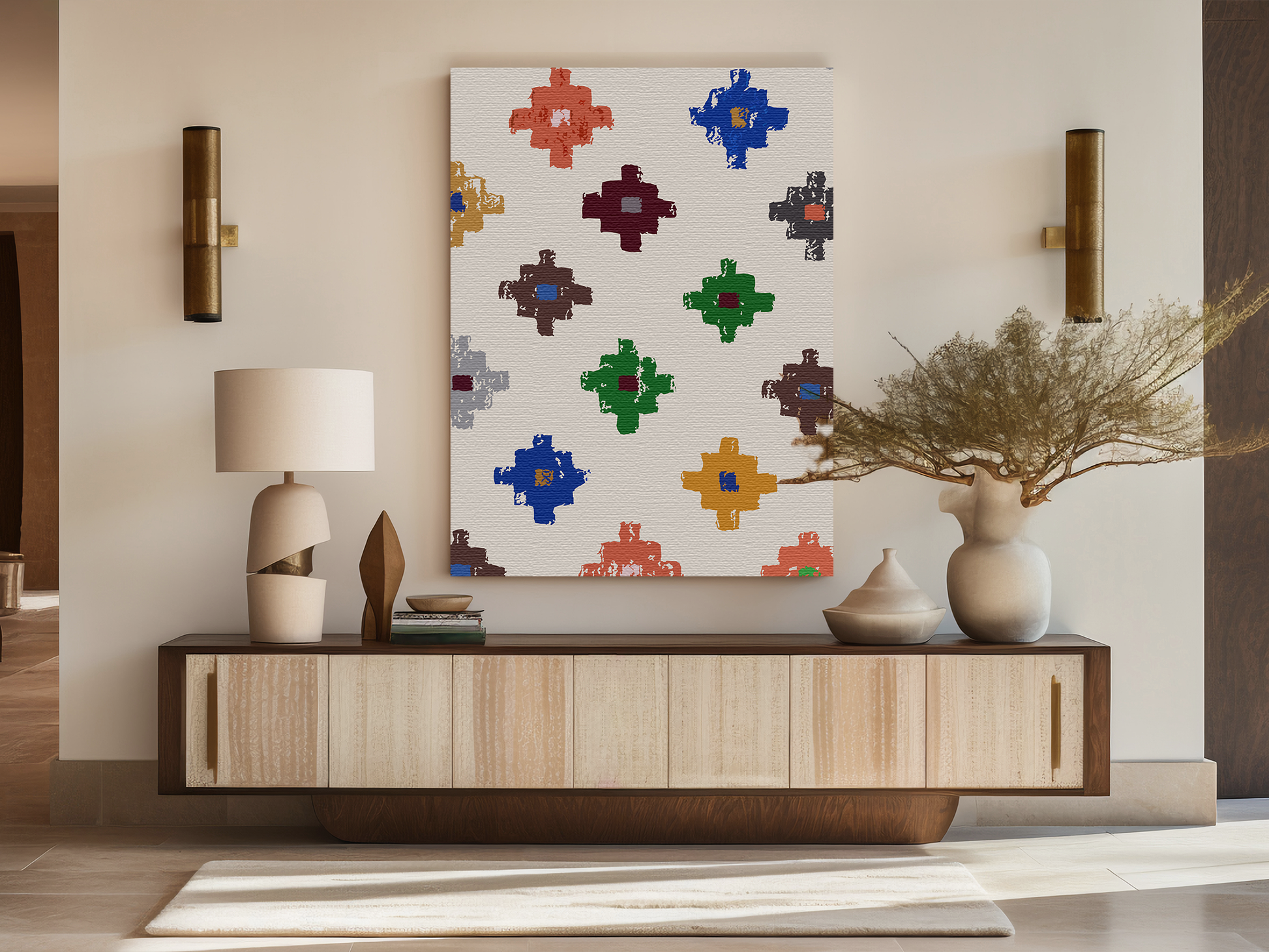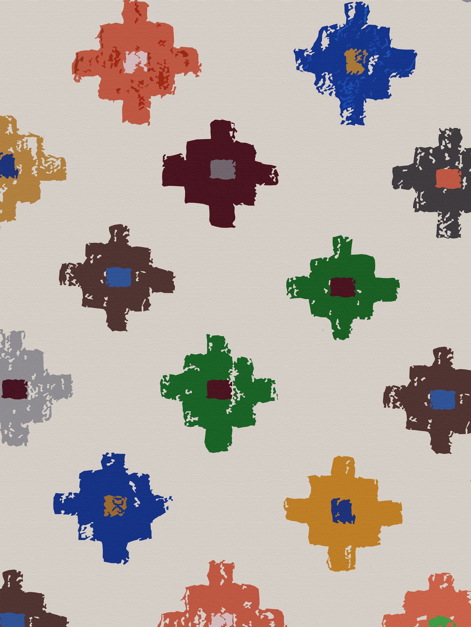 Tiny kilim crosses dance like bright confetti across a sun-bleached ground. Folk Confetti celebrates the joy tucked inside traditional Egyptian weavings, scattering their iconic shapes in punchy hues of cobalt, terracotta, emerald and saffron. The playful palette enlivens the neutral base, giving heritage pattern a fresh, modern beat.