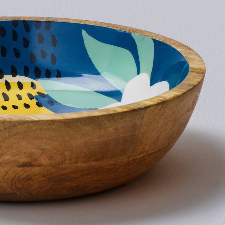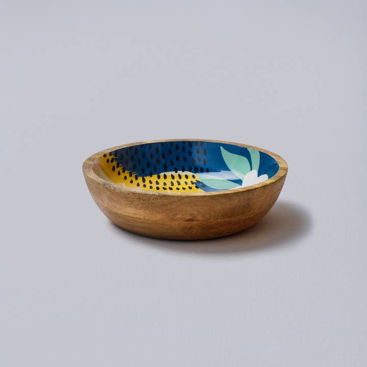 Hand-painted mango-wood bowl with a lively mix of abstract and floral motifs in blues, yellows, pinks, and greens. Light yet durable, it brings warm grain and quiet colour to everyday tables—ideal for snacks, small salads, or relaxed sides. Each piece is finished by hand, so subtle variations in pattern and tone make every bowl unique.