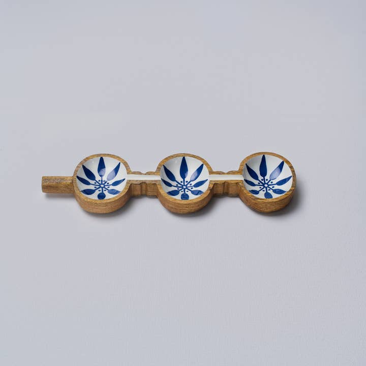 Handcrafted from mango wood with a hand-painted enamel detail, this long serving platter brings warm grain and quiet colour to relaxed tables. Sized for snacks, appetisers, or condiments—and just as useful as a catch-all on consoles or bedside tables. Each piece is painted by hand, so subtle variations in pattern and tone make every platter unique.