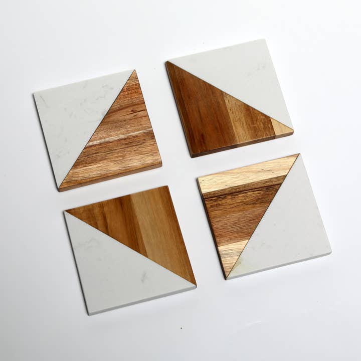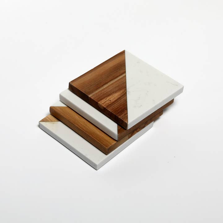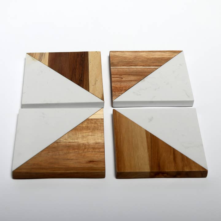 Set of four square coasters pairing cool marble with warm acacia—quiet, natural accents for everyday tables and special occasions. A smooth, rounded-edge profile and non-slip feet keep glasses steady, while a food-safe sealed finish makes cleanup easy. Simple, sturdy, and made to last.