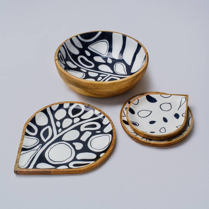 Handcrafted from sustainably sourced mango wood, this monochrome serving board pairs warm natural grain with a bold, hand-painted teardrop motif. Light yet durable, it’s sized for relaxed sharing—snacks, breads, cheeses—or as a simple statement piece on consoles and counters. Each one is painted by hand, so subtle variations in pattern and tone make every board unique.