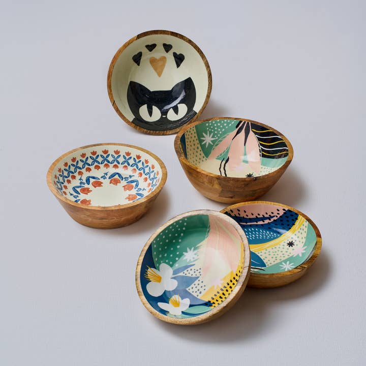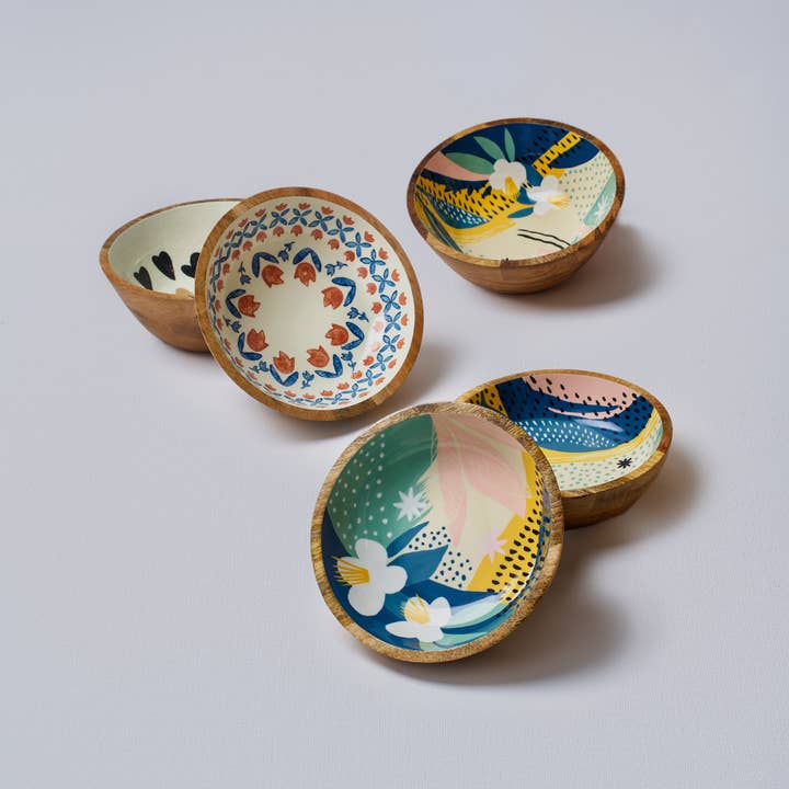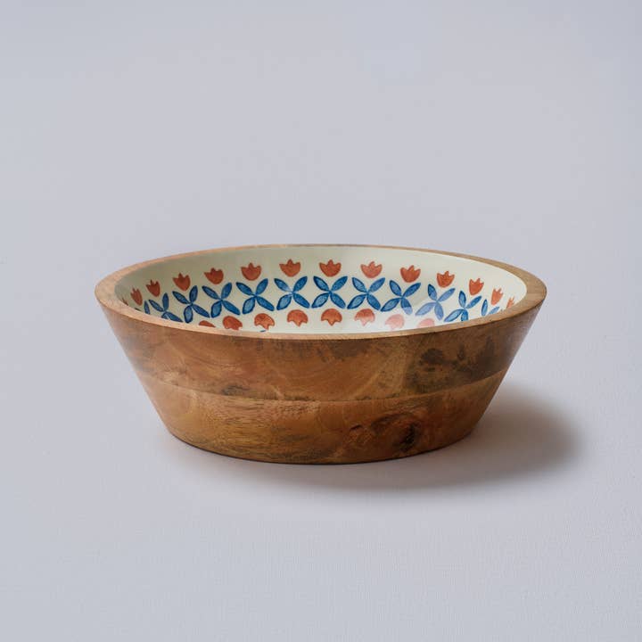 Handcrafted mango-wood bowl with a hand-painted floral interior—alternating blue and orange stylised blooms set on a soft cream ground. Light yet durable, it brings warm grain and quiet colour to the table, sized for snacks, small salads, or relaxed sides. Each piece is painted by hand, so subtle variations in pattern and tone make every bowl unique.