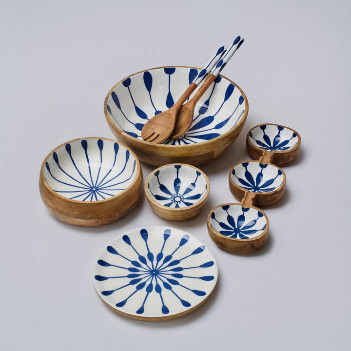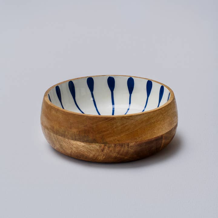 Handcrafted from mango wood with a hand-painted enamel interior, this bowl brings warm grain and quiet colour to everyday tables. Light yet durable, it’s sized for snacks, small salads, or relaxed sides—and just as lovely as a simple decorative catch-all. Each piece is finished by hand, so subtle variations in tone and pattern make every bowl unique.