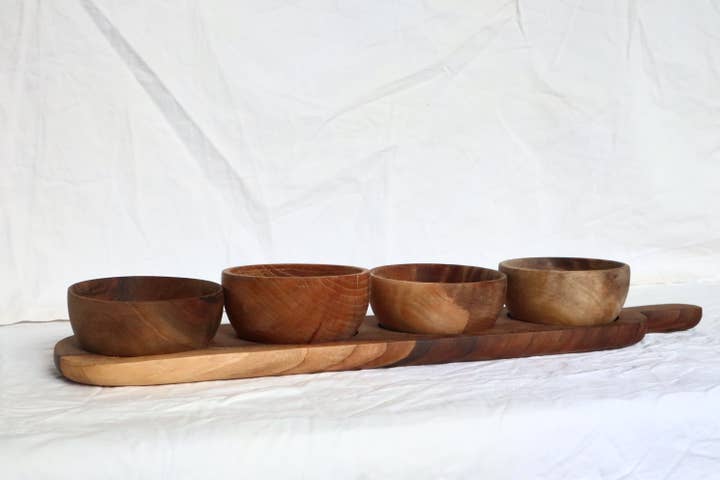 Handcrafted in walnut wood, this serving set pairs a long board with small bowls—simple, tactile pieces for fruit, nuts, crisps, and relaxed sharing. Natural variations in grain and tone make each set quietly unique with a warm, organic presence on the table.